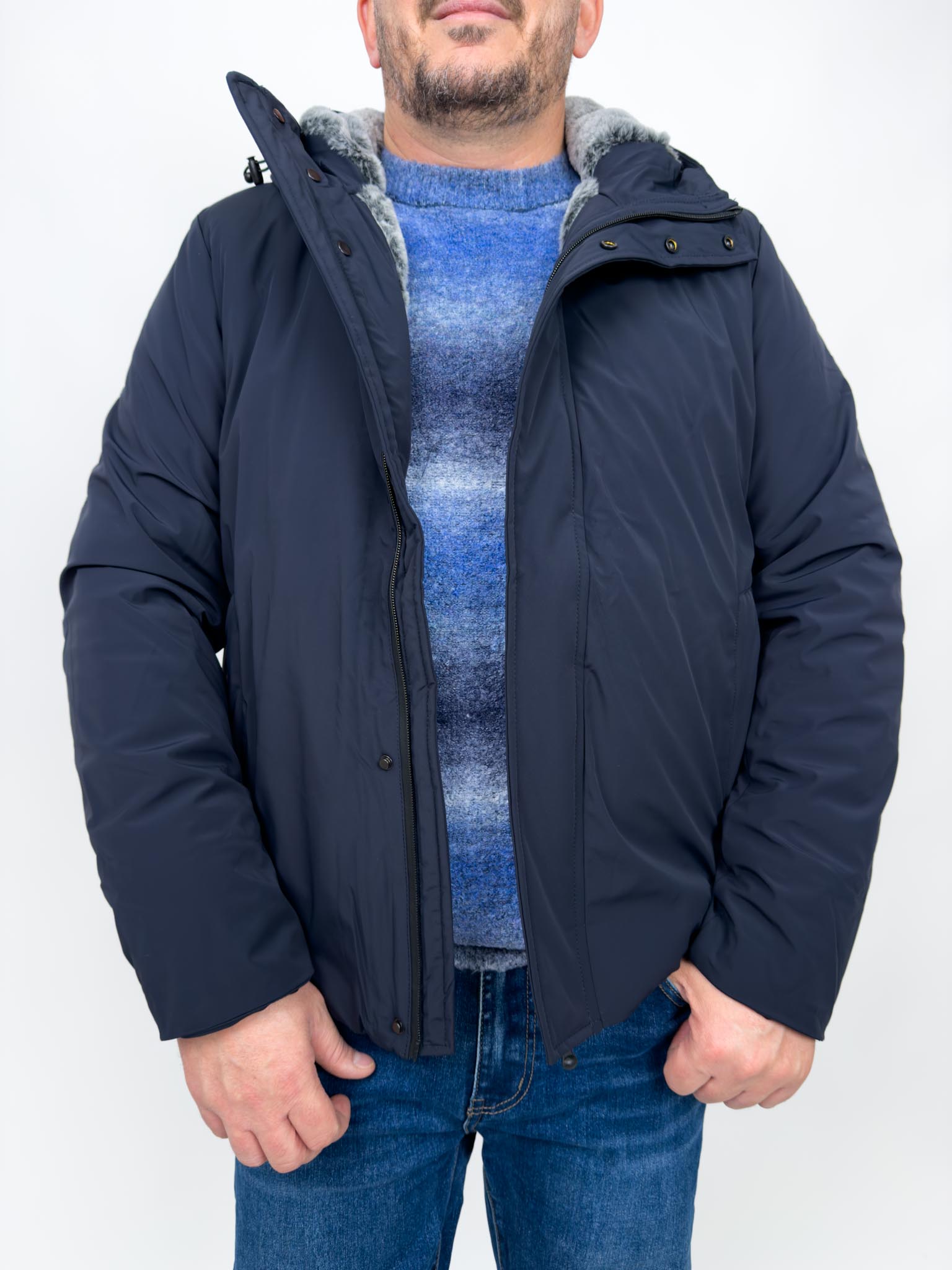 Piumino invernale imbottito in eco pelliccia rasata.