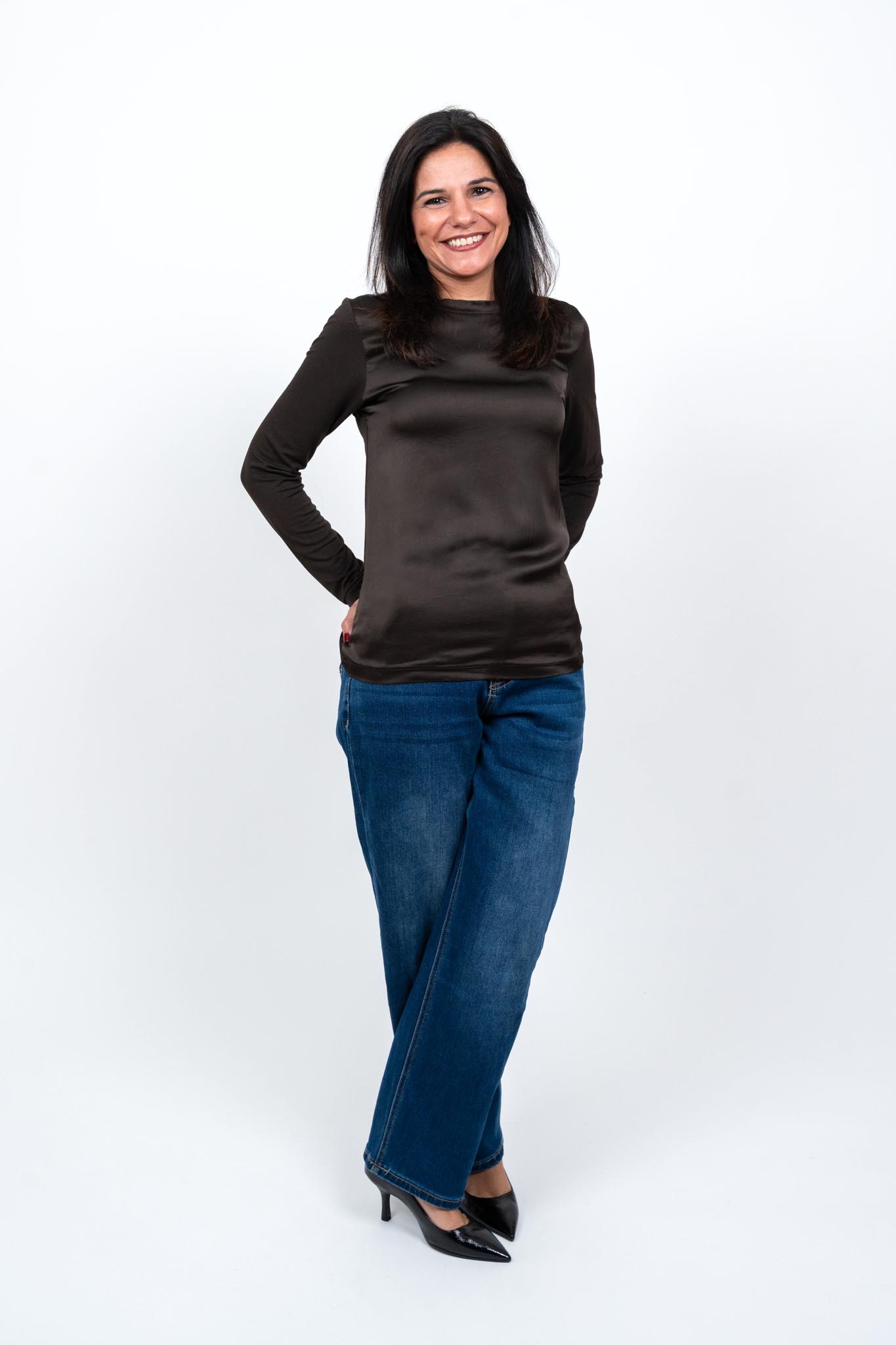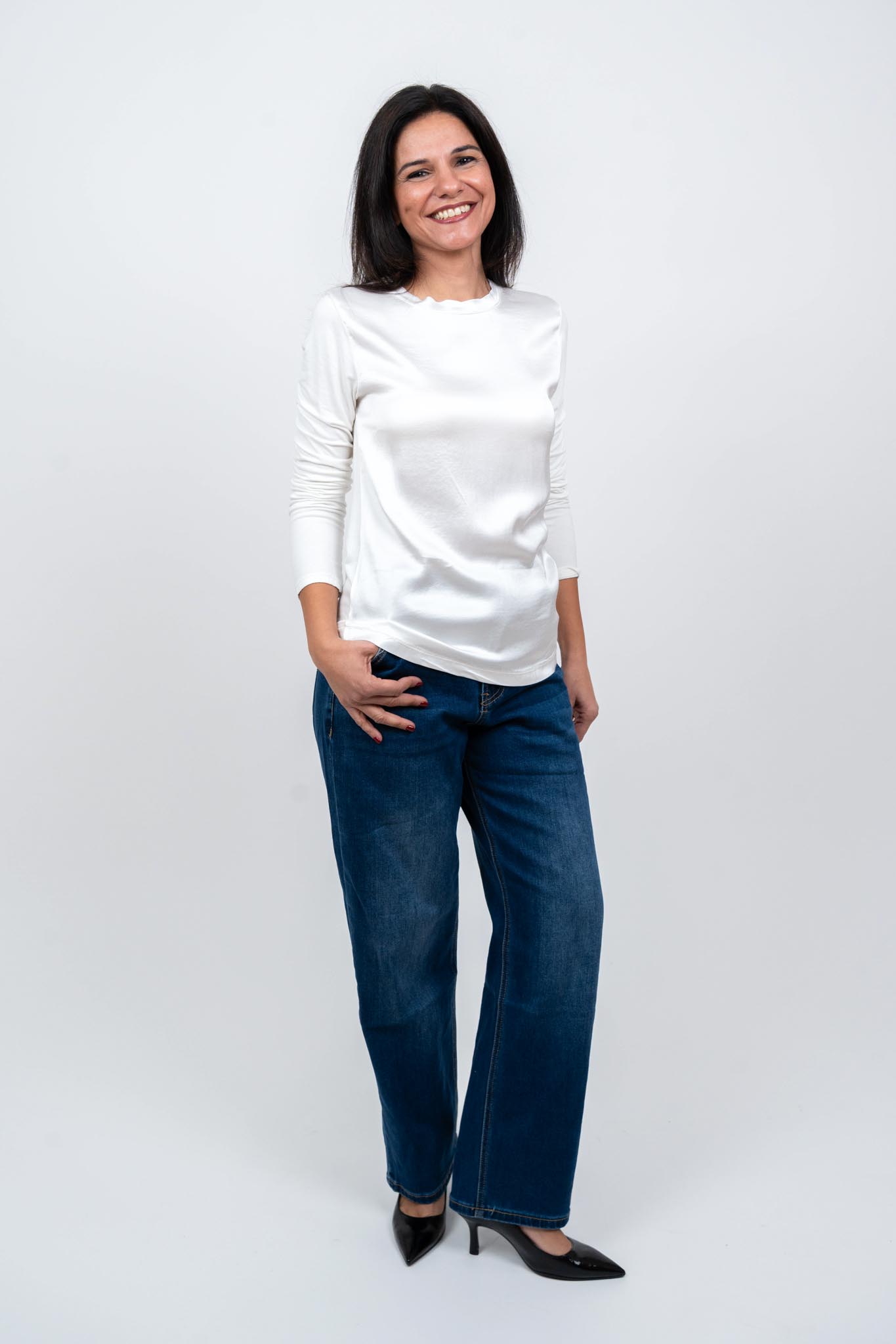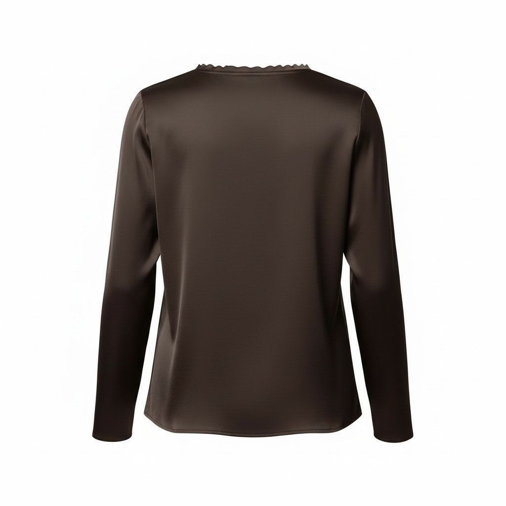 Maglia girocollo in satin sul d’avanti e maglina di viscosa dietro.